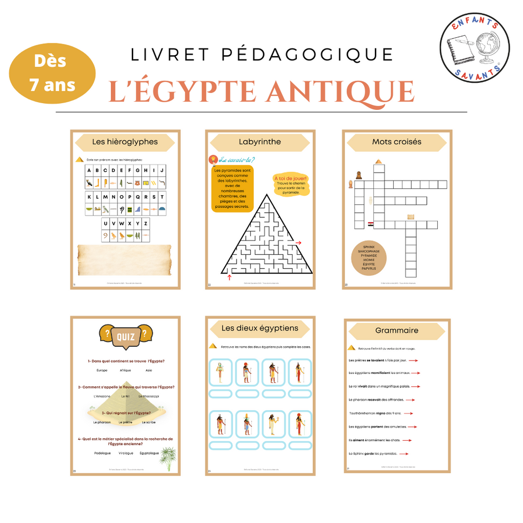 Les pyramides, la société égyptienne, les dieux égyptiens, la découverte des hiéroglyphes, à travers divers jeux et exercices ludiques.